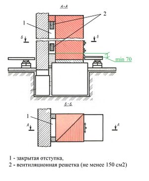 В стенах, закрывающих отступку, следует предусматривать отверстия над полом и вверху с решетками площадью живого сечения каждой не менее 150 см2. Пол в закрытой отступке должен быть из негорючих материалов и располагаться на 70 мм выше пола помещения.