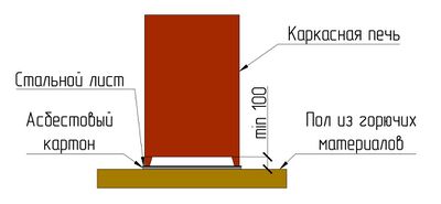 Рис. 3 Установка каркасной печи на ножках на полу из горючих материалов
