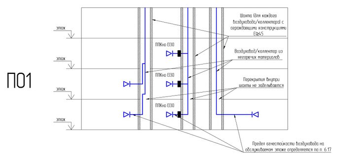 В указанной шахте допускается прокладка воздуховодов систем противодымной (вытяжной и/или приточной) вентиляции (см. рис. 4 ниже). Воздуховоды систем противодымной вентиляции должны быть с нормируемым пределом огнестойкости (Письмо №ИГ-117-221-13-2 от 24.02.2022). Предел огнестойкости указанных воздуховодов – по п. 7.11б, 7.17б соответственно, клапанов – по п. п. 7.11в, 7.17д соответственно.
