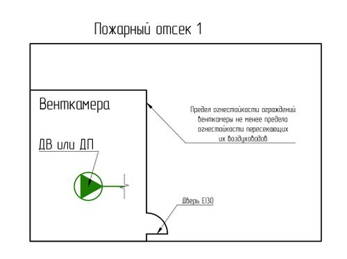 Рис. 1 Вентиляционные камеры систем общеобменной вентиляции в пределах обслуживаемого пожарного отсека. Вариант 1