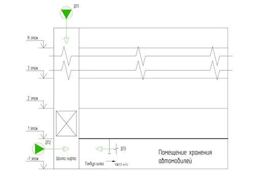 8.7 При выходах из лифтов в помещения хранения автомобилей подземных автостоянок следует предусматривать тамбур-шлюзы, защищаемые приточной противодымной вентиляцией. Если такие лифты имеют не менее двух остановок на вышележащих надземных этажах, то на этажах подземной автостоянки необходимо устройство двух последовательно расположенных тамбур-шлюзов для отделения выходов из этих лифтов в помещения хранения автомобилей, защищаемых отдельными системами приточной противодымной вентиляции.