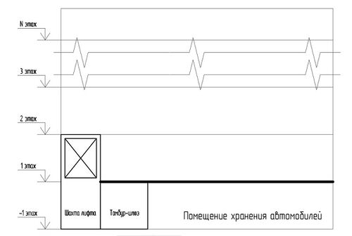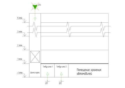 Рис. 2 Парно-последовательно расположенные тамбур-шлюзы перед шахтой лифта подземной автостоянки при сообщении шахты с не менее чем двумя этажами надземной части