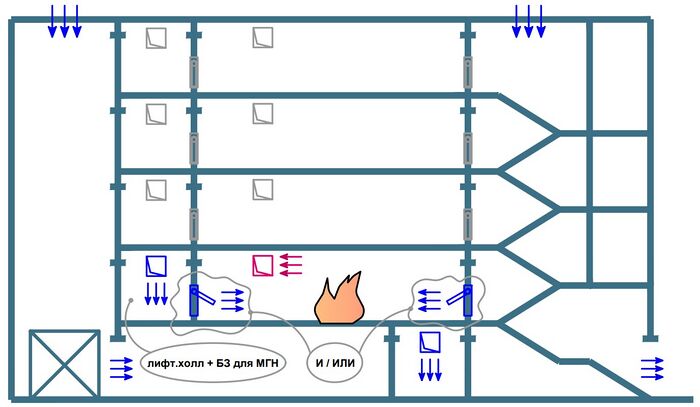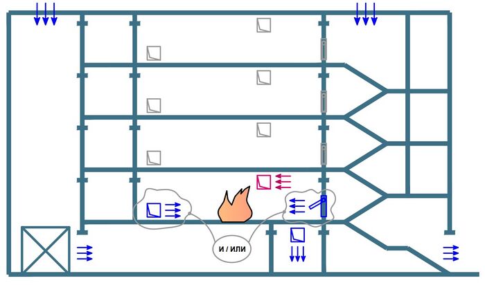 – на границе между защищаемым приточной противодымной вентиляцией помещением и помещением с очагом пожара;