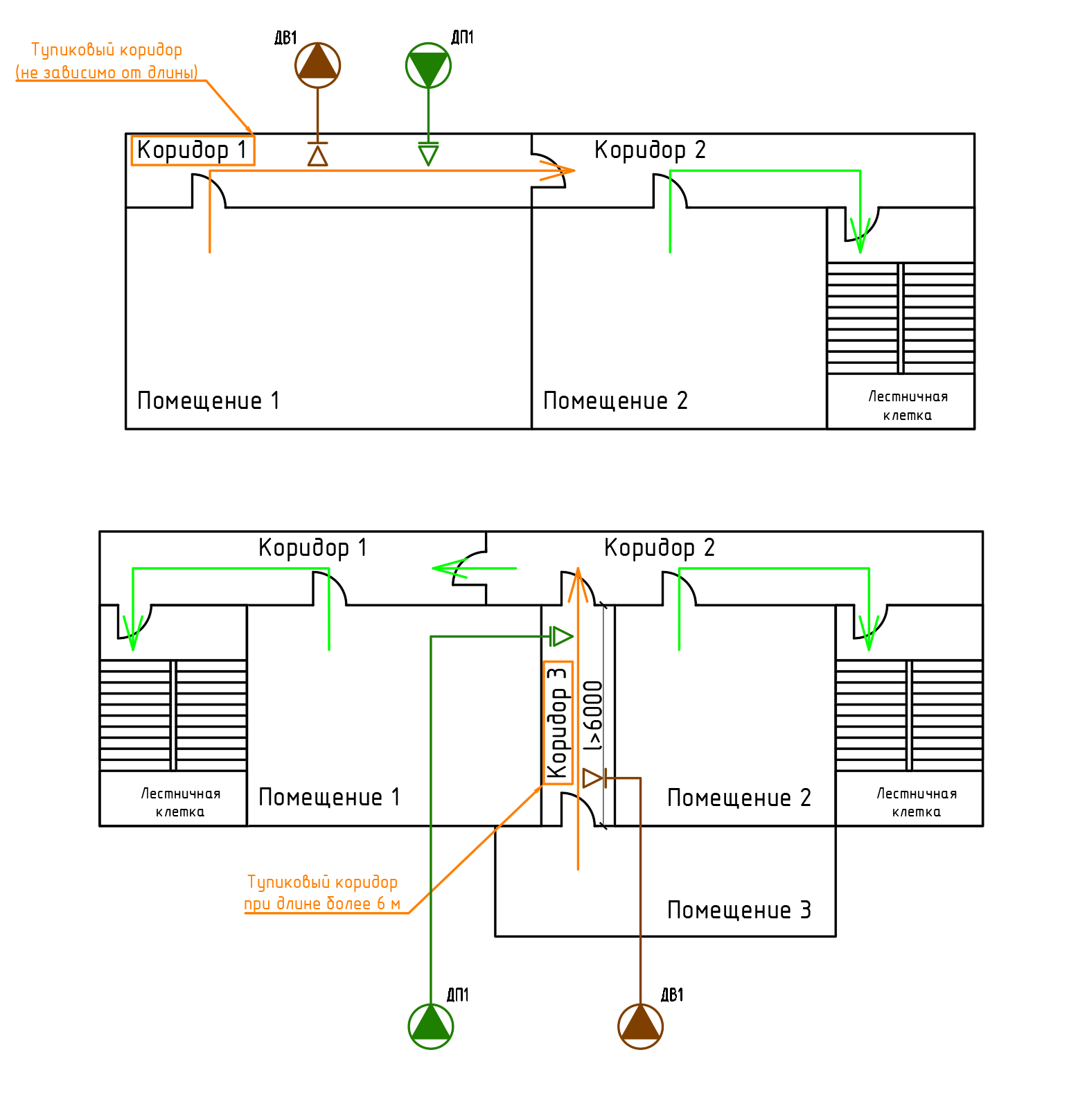 При необходимости отделения тупиковых коридоров, образованные тупиковые коридоры подлежат защите системами вытяжной противодымной вентиляции