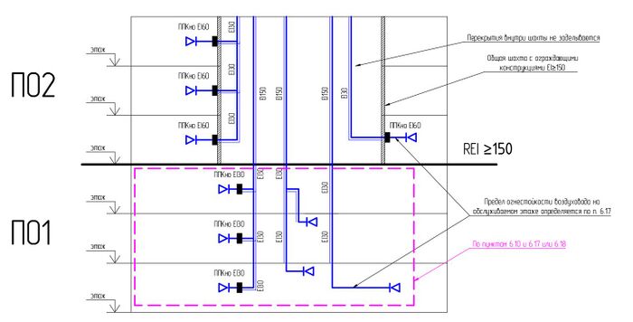а) транзитные воздуховоды и коллекторы в пределах обслуживаемого пожарного отсека предусматриваются с пределом огнестойкости EI 30, поэтажные ответвления присоединяются к вертикальным коллекторам через противопожарные нормально открытые клапаны;