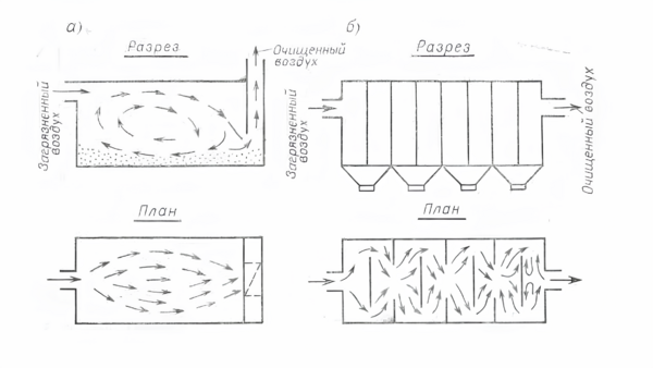 Рис. 2 Пылеосадочные камеры: а – простая; б - лабиринтнаяПростейшим типом пылеуловителей являются пылеосадочные камеры (рис. 2). Осаждение в них пыли из запыленного воздуха происходит за счет ее собственной силы тяжести при снижении скорости движения воздуха в камере. Для повышения эффективности и уменьшения длины камеры ее разбивают на ряд каналов или устраивают лабиринты.