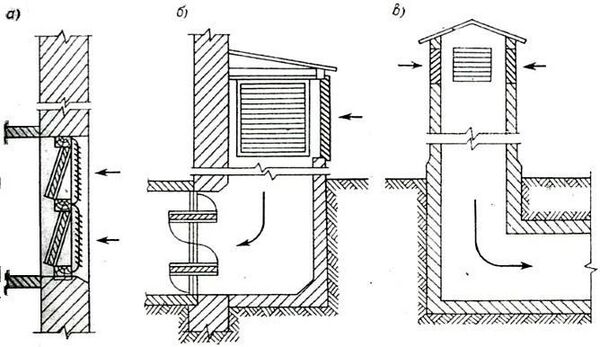 Рис. 1 Воздухозаборная шахта: а – встроенная; б – пристроенная; в – отдельно стоящая