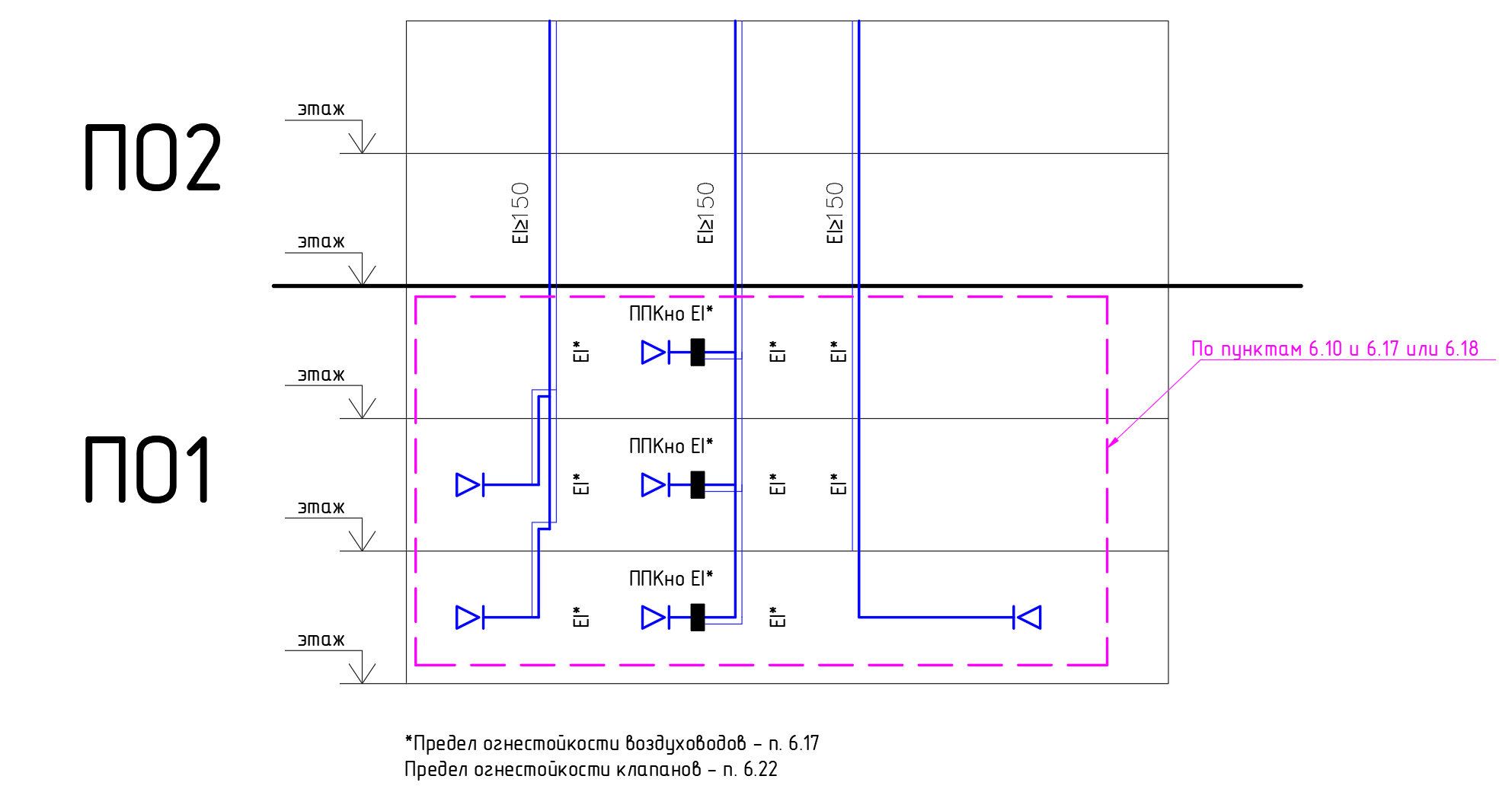 Транзитные воздуховоды, прокладываемые за пределами обслуживаемого пожарного отсека