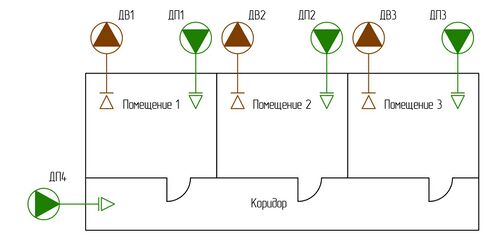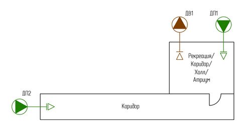 Рис. 20 Подача воздуха для создания избыточного давления коридорах, сообщающихся с рекреациями, другими коридорами, холлами, атриумами, защищаемыми системами вытяжной противодымной вентиляции