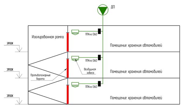 Рис. 17 Рампа отделена от помещений хранения автомобилей противопожарными воротами с воздушными завесами
