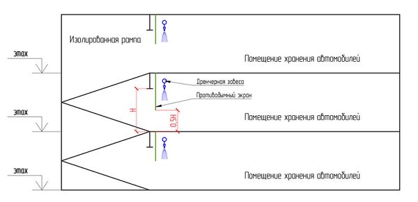 Рис. 18 Рампа отделена от помещений хранения автомобилей противодымными экранами с дренчерными завесами