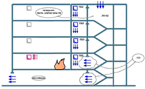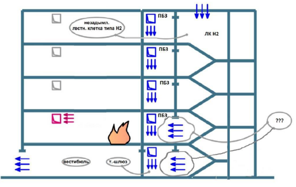 Согласно п. 8.4 СП 7.13130.2013 (с Изм. 1–3) в зданиях высотой более 28 м выход из незадымляемой лестничной клетки типа Н2 в вестибюль следует устраивать через тамбур-шлюз с подпором воздуха во время пожара. Допускается устройство выхода из незадымляемой лестничной клетки типа Н2 в вестибюль без устройства тамбур-шлюза в соответствии с [5]. В этом случае при определении расхода воздуха, подаваемого системой приточной противодымной вентиляции в описанные выше незадымляемые лестничные клетки типа Н2, следует учитывать одновременное открытое положение дверных проемов на этаже с очагом пожара и одного из выходов: в вестибюль (фойе, холл); наружу, принимая при этом большее из полученных значений.