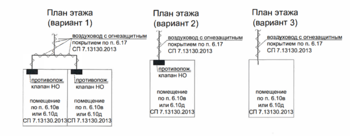 Пункт 6.11, судя по всему, является разъяснением п. 6.10, так как п. 6.11 содержит отсылку к п. 6.10: «ППК, указанные в подпунктах "а", "в", "г" и "д" пункта 6.10, следует устанавливать в проёмах ограждающих строительных конструкций...». При этом п. 6.11 содержит оговорку, которая, собственно, и не ясна: «Если по техническим причинам установить противопожарные клапаны или воздушные затворы невозможно, то объединять воздуховоды из разных помещений в одну систему не допускается. В этом случае для каждого помещения необходимо предусмотреть отдельные системы без противопожарных клапанов или воздушных затворов». Вопрос 1 следующий: допускается ли в соответствии с п. 6.11 СП 7.13130.2013 в описанных в пп. 6.10в и 6.10д условиях не устанавливать ППК, если система обслуживает только одно помещение (см. ниже План этажа (вариант 3))? Или же ППК необходимо устанавливать (для условий, описанных в пп. 6.10в и 6.10д) всегда: и на системах, обслуживающих только одно помещение (см. ниже План этажа (вариант 1)), и на системах, обслуживающих несколько помещений (см. ниже План этажа (вариант 2))?