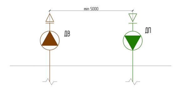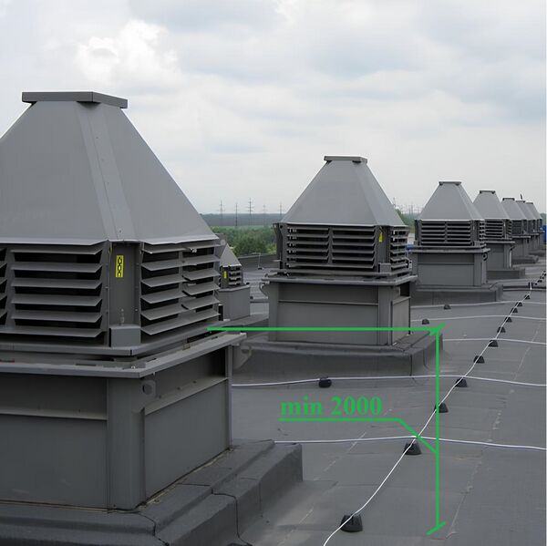 г) выброс продуктов горения над покрытиями зданий и сооружений на расстоянии не менее 5 м от воздухозаборных устройств систем приточной противодымной вентиляции; выброс в атмосферу следует предусматривать на высоте не менее 2 м от кровли из горючих материалов; допускается выброс продуктов горения на меньшей высоте при защите кровли негорючими материалами на расстоянии не менее 2 м от края выбросного отверстия или без такой защиты при установке вентиляторов крышного типа с вертикальным выбросом.